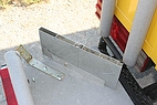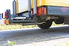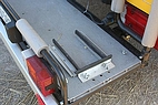 Am Postbus war ja schon der Orginal-Tritt am Heck dran, auf den wurde ein Grundträger für Motorräder geschraubt. Der Grundträger wurde dann durch eine Plattform und diverse Halterungen für die Befestigung des Rollers ergänzt. Der Roller wird über eine Auffahrschiene mittels Motorkraft auf den Träger befördert und mit Spannbändern befestigt. Der Orginaltritt wurde durch diverse Stahlwinkel von einem Anhägerbauer, der bei unserem TÜV bekannt und geschätzt ist, verstärkt. So hatte ich auch bei der Vollabnahme keine Probleme. Der Motorradträger wurde für 130 kg abnehmbar eingetragen.
