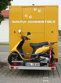 Der Nachteil an einem Wohnmobil gegenüber einem Wohnwagen mit PkW vorne dran ist der, dass man, wenn man länger an einem Ort ist, mit dem PKW mobil ist. Deshalb haben wir uns entschieden, einen Motorroller hinten drauf zu packen. Damit es schneller dahingeht wurde eine 125 ccm Zweitakter Piaggio gekauft - ein richtig heisses Teil - nichts für Fahranfänger - geht echt teuflisch. Ausserdem war sie natürlich gelb.