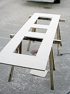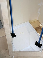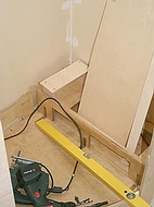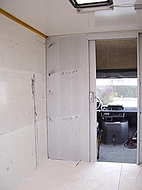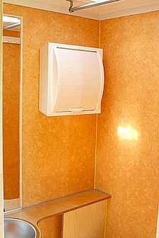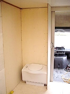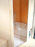 4. Wohnmobil NasszelleFür den Einbau der Toilette und der Dusche kam nur ein Platz in Frage. Hinter dem Fahrerhaus in Fahrtrichtung links. Die Grundfläche beträgt 90x80 cm mit einer abgeschrägten Ecke. Nicht sehr groß, aber ausreichend für all die Dinge, die man da drin tut. Auf dieser Fläche mußte also eine Thetford Cassette C-402 / X, ein Waschbecken und die Dusche untergebracht werden, inklusive Kalt- und Warmwasserinstallation. Das Warmwasser wird übrigens über einen 12V Edelstahl Boiler von Elegna Nautic-therm TYP ME erzeugt. Die Wände wurden, wie der gesamte Innenausbau, aus Multiplex Birke gebaut, nicht gerade billig, aber stabil und relativ verzugsfrei. Um Gewicht zu sparen wurde die Türe mit Aussparungen für Aluminiumblenden versehen, was sich auch optisch ganz gut macht. Die Kunststoffduschwanne von Reimo wurde an einer Seite abgeschrägt und auf einem Podest mit PU Schaum eingeklebt. Die Höhe des Podests wurde so gewählt, dass das Abwasser gut abläuft. Beim Ausschäumen mit PU Schaum ist die Ablaufinstallation so auszusparen, dass man später bei Undichtigkeit noch rankommt. Die Innenwände wurden mit PVC Bodenbelag ausgekleidet und mit Silicon abgedichtet, wie übrigens alle Kanten. Es gibt bessere Lösungen, wie man eine Dusche dicht bekommt, aber da wir die Dusche nur als Notdusche verwenden wollen, ist das denke ich OK. Zur Lüftung haben wir eine Fiamma Dachlucke 40x40 cm mit Moskitonetz eingebaut.