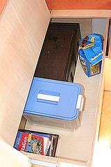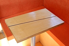 Zum Essen oder Frühstücken bei schlechtem Wetter reicht es allemal, ansonsten sind wir eher die Freiluftfanatiker. Damit der Tisch nicht zu hinderlich ist beim sich Einfädeln in die Sitzecke haben wir ihn ausklappbar gemacht. Zum Essen wird er ausgeklappt, zum Weintrinken bleibt er zu. Die Ausklappteile sind abgeschrägt, was das Aufstehen im ausgeklappten Zustand erleichtert. Darunter sind 4 Ausklappstreben zur Verstärkung angebracht. Die Tischplatte ist aus Multiplex Birke, mit Schiffslack eingelassen. Der Standfuß ist aus dem Baumarkt und ist fest mit dem Boden verschraubt. Unter den Sitzbänken sind Staukästen für allerlei Kram. Im Staukasten an der Aussenwand ist die 220 V Aussensteckdose, der Sicherungskasten sowie der FI untergebracht. Die Staukästen sind mit doppeltem Boden ausgestattet, in diesem verlaufen Kabel, Abflussrohr der Nasszelle sowie Warm- und Kaltwasserzulauf. Die Polster sind aus Schaumstoff, der mit Microfaser überzogen wurde - das gleiche Kaltschaummaterial wie die Matratze. über die Farbe kann man streiten, wir finden's total schräg. |