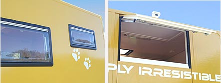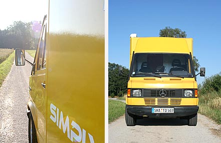 Da die Außenformen weitestgehend durch das Orginalfahrzeug feststand wurde diese nur im Heckbereich geändert durch den Einbau eines Heckstauraums und einer Heckklappe oben. Es wurden 3 weitere Dometic-Seitz Fenster und zwei Dachhauben Fiamma eine davon mit Turbo Vent eingebaut. Auf dem Dach haben wir eine Omnistore Markise und eine Solaranlage von Mobile Technology sowie eine Rückfahrkamera installiert. Der Koffer wurde neu lackiert, natürlich stehen wir total auf das Postgelb.