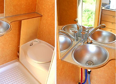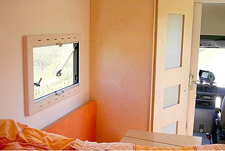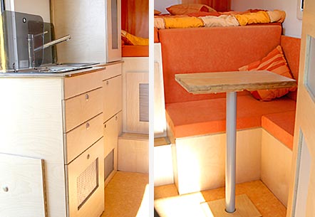 Wohnmobilausbau InnenansichtenAussen gelb - innen orange, weiss und Birke hell